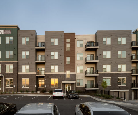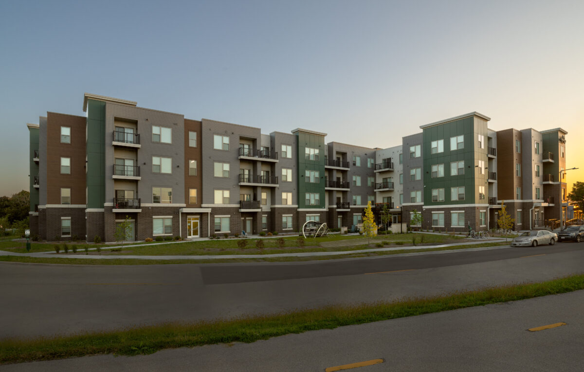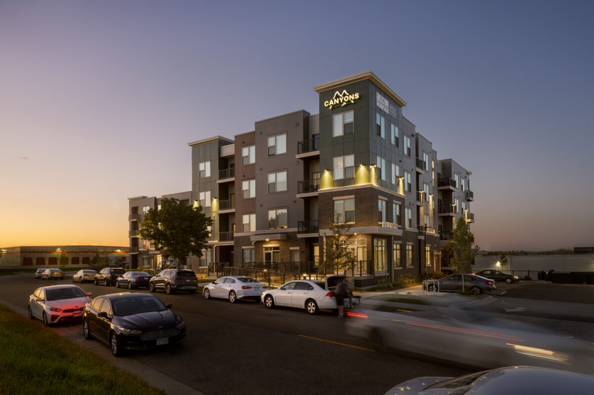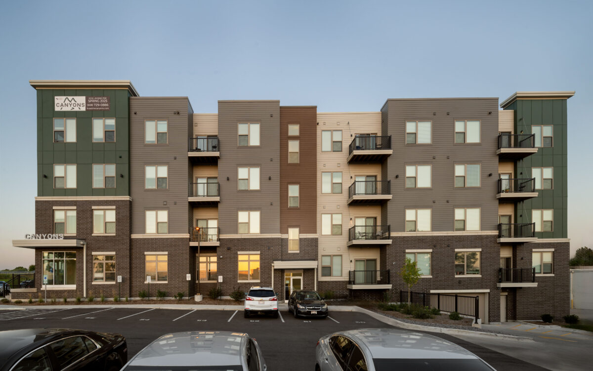 Located in Madison, Wisconsin, Canyons is a 60-unit affordable housing residence. The podium-style building features four stories of wood frame construction atop an underground concrete parking garage. Its exterior showcases a modern blend of Hardie fiber-cement siding and masonry brick veneer.
